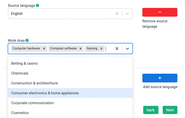 We’ll ask you to add your language skills – these include both languages and domain knowledge.